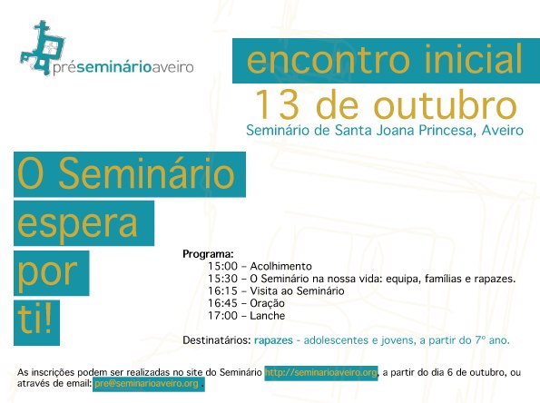 Obs.: As inscrições podem ser realizadas no site do Seminário http://seminarioaveiro.org, a partir do dia 6 de outubro, ou através de email: pre@seminarioaveiro.org .