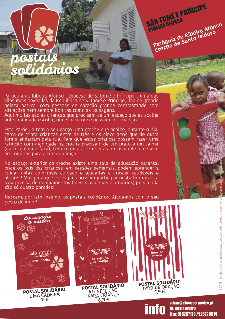 A parceria entre o SDAM e a Paróquia de Ribeira Afonso, em São Tomé e Príncipe, permite pelos postais solidários, desenvolver a economia local, de forma sustentável, pelo que todo o material será feito e/ou comprado em São Tomé e Príncipe, após o término da campanha.