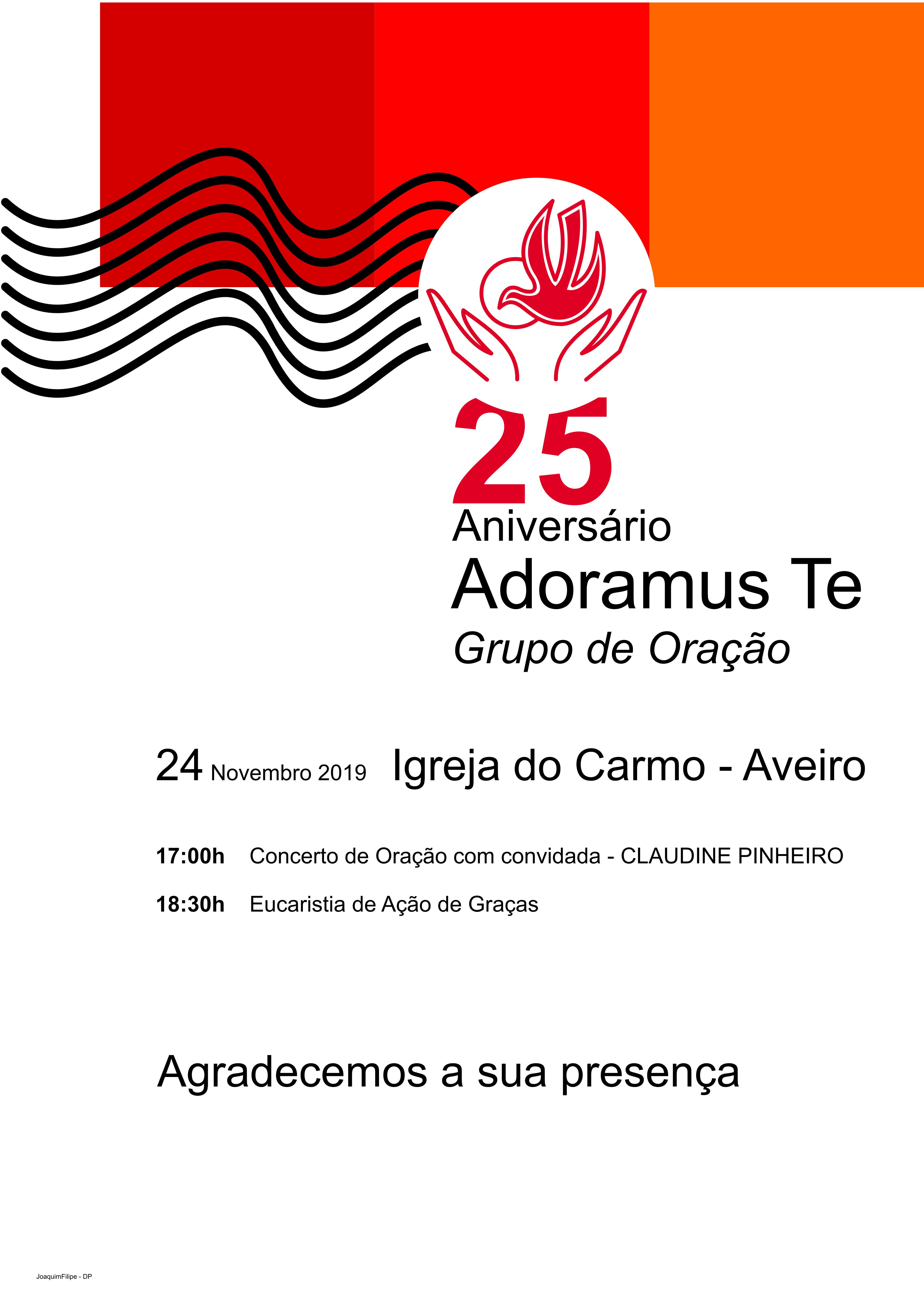 O Grupo de Oração Adoramus Te da Igreja do Carmo de Aveiro comemora 25 anos de existência no próximo dia 24 de novembro 2019, na Festa do Cristo Rei. Nesse domingo, realizar-se-á um concerto de oração, na igreja do Carmo em Aveiro, com a Claudine Pinheiro, cantora católica bastante conhecida pela sua voz angelical e pela forma como conduz à oração, famosa pela música “Tu és a água viva…”.