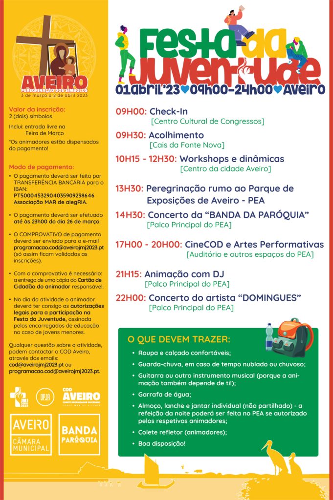 A Festa da Juventude será o culminar da peregrinação dos símbolos da JMJ pela Diocese de Aveiro. Pretende-se assim reunir todos os jovens da diocese num verdadeiro Mar de Alegria.