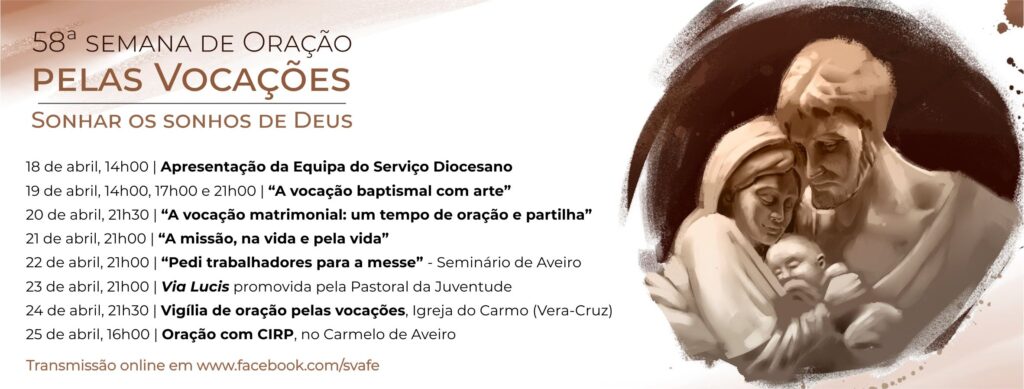 A Igreja Universal vai celebrar entre os dias 18 a 25 de Abril a 58º Semana de Oração pelas Vocações, destacando-se a mensagem do Papa Francisco para esta semana «São José: O sonho da Vocação». Neste contexto, o Serviço diocesano de vocações, acolhimento e formação espiritual iniciará as suas atividades, com o seguinte esquema de atividades na próxima semana, que dadas as contingências que vivemos, serão predominantemente online:
