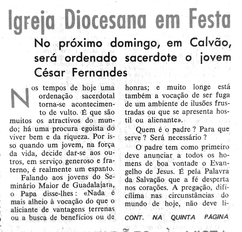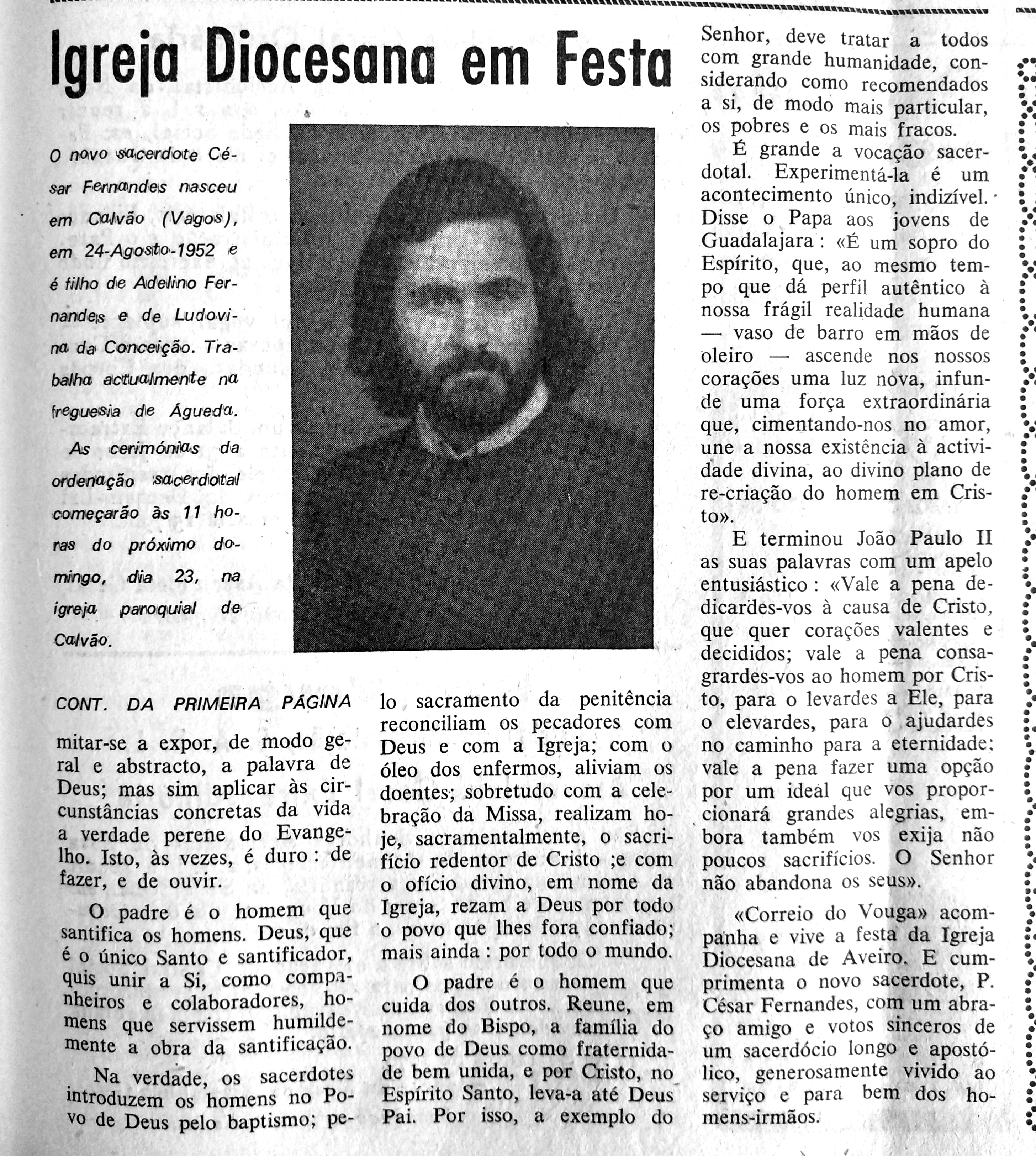Ordenado presbítero a 23 de setembro de 1979 na Igreja Matriz de Calvão por D. Manuel de Almeida Trindade, iniciou o seu múnus pastoral como coajdutor na paróquia de Aradas.