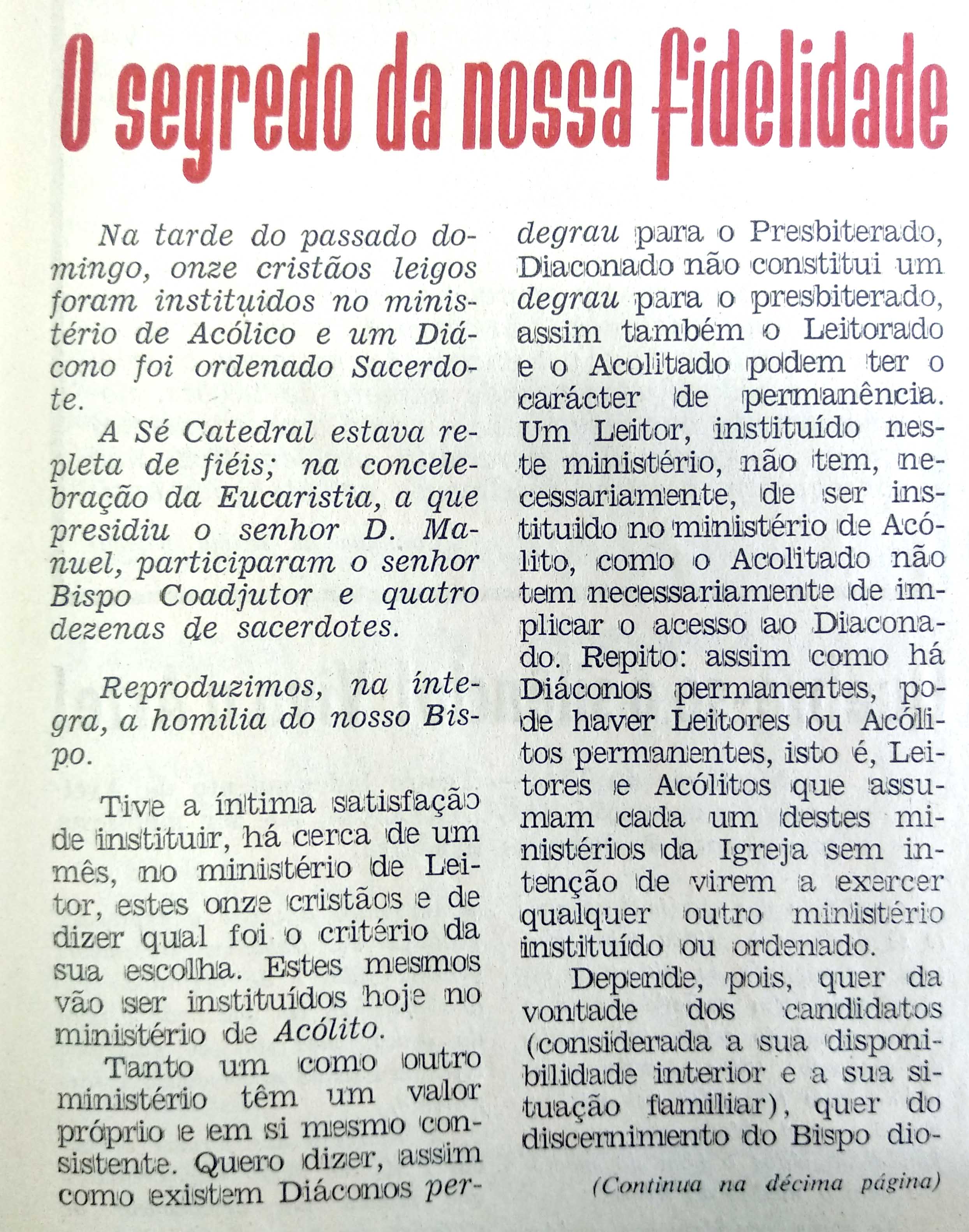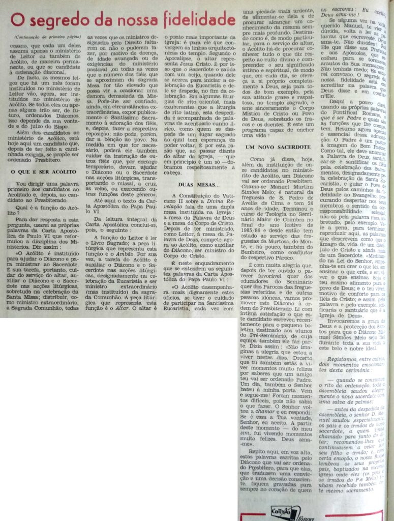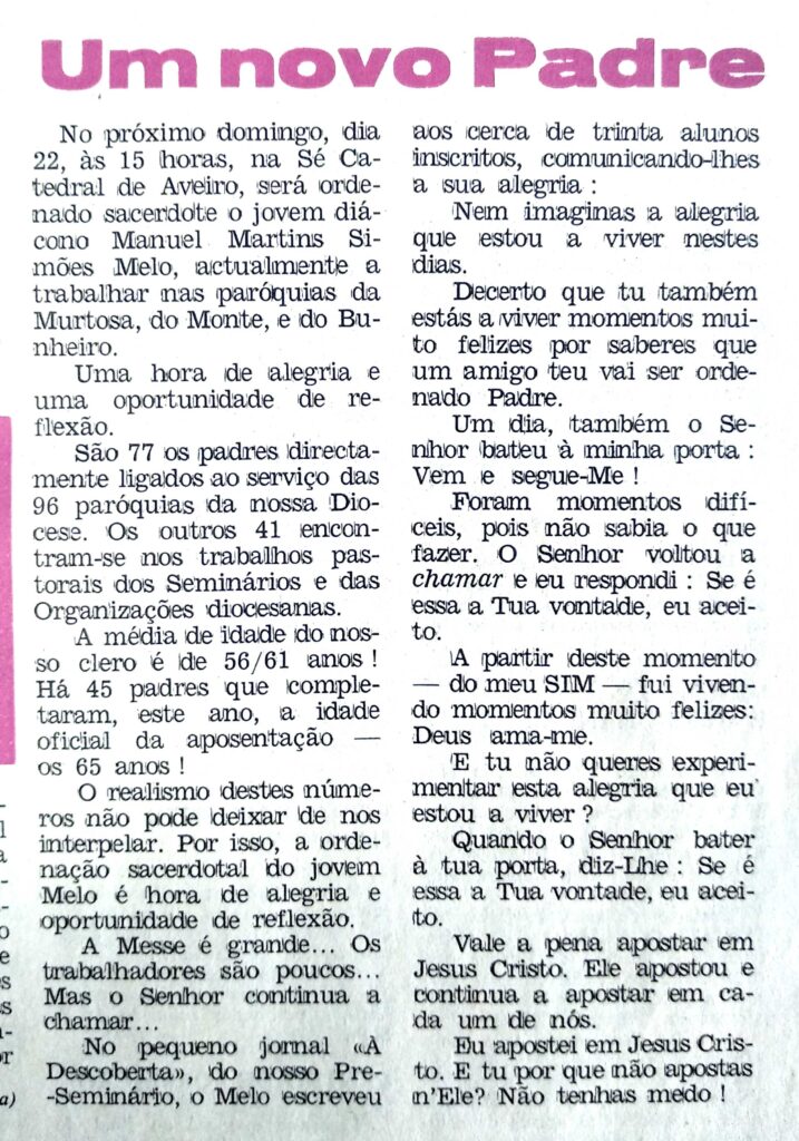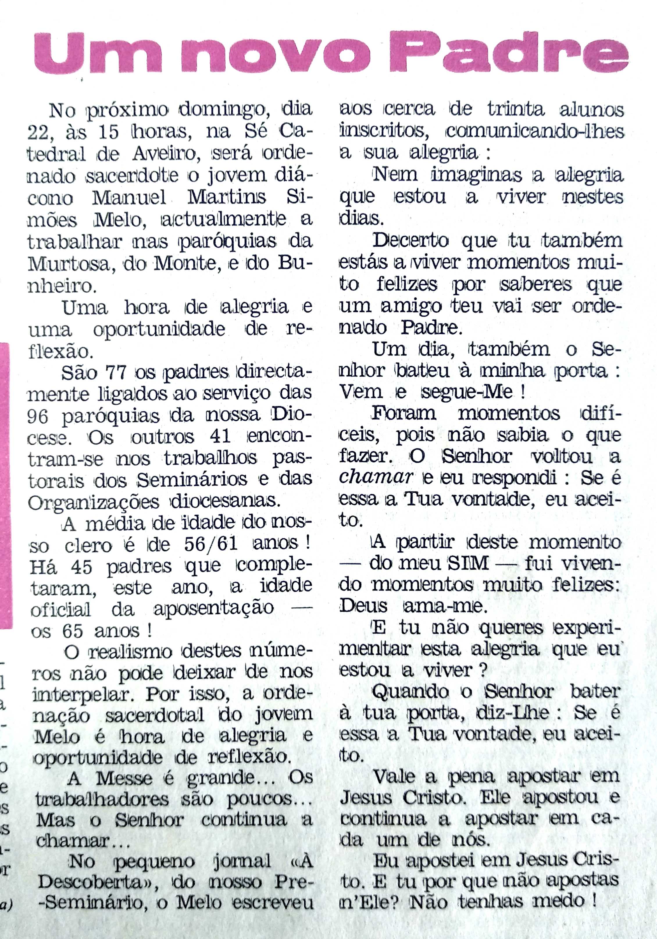 Iniciou o seu múnus pastoral, ainda diácono, como colaborador do pároco da Murtosa e do Monte, que acumulou com a paróquia do Bunheiro logo após a ordenação.