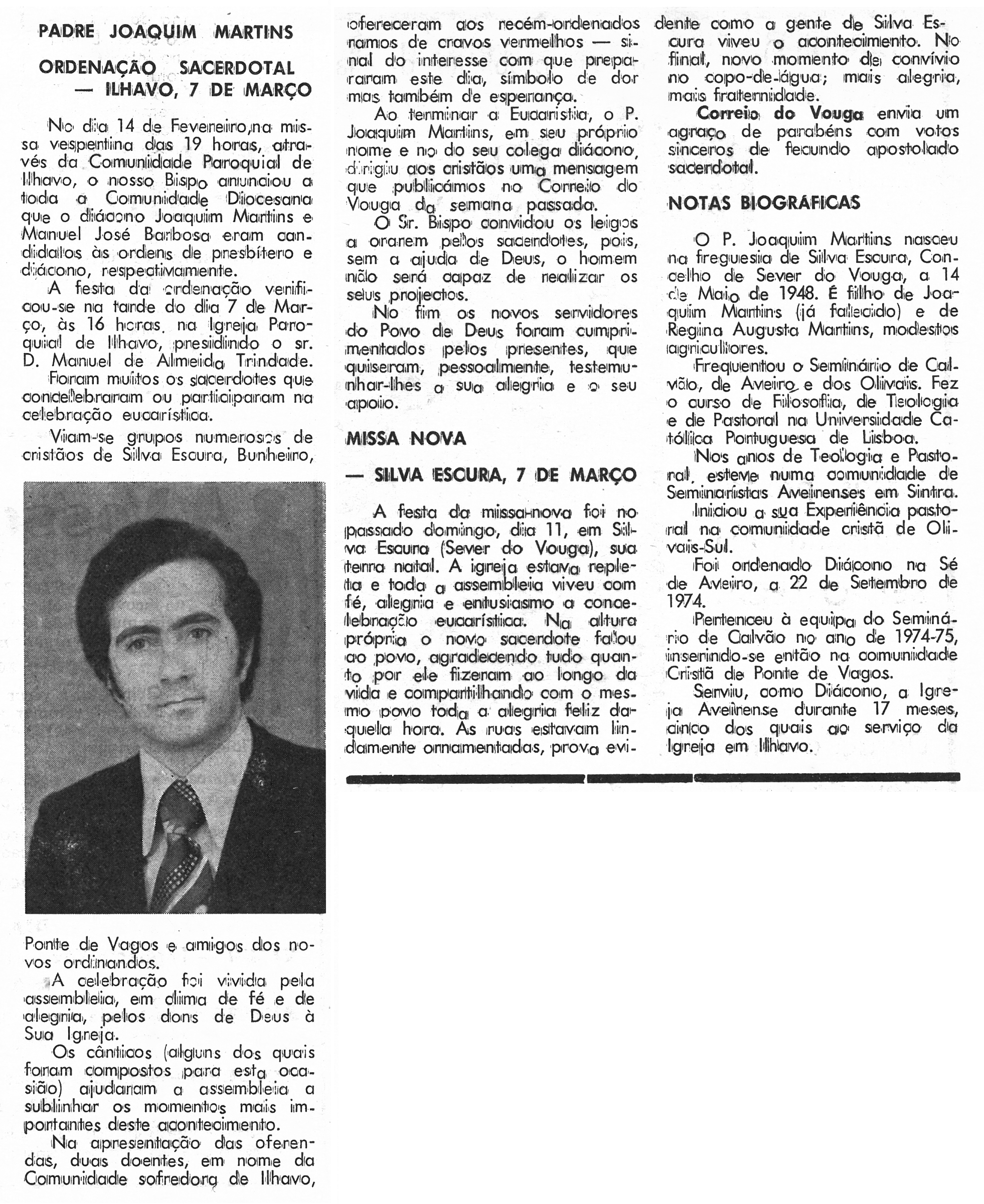 Foi ordenado presbítero a 7 de março de 1976 por D. Manuel de Almeida Trindade na Igreja Paroquial de Ílhavo, onde iniciou o seu serviço pastoral.