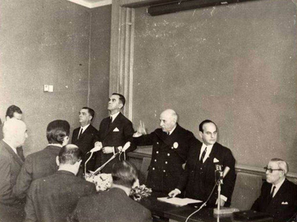 O professor Manuel dos Reis toma a palavra durante a inauguração da Faculdade de Matemática, no dia 17 de abril de 1969 (foto de cima; sentado na foto de baixo). Na mesa estão também, a partir da esquerda, o reitor da Universidade de Coimbra, o ministro das Obras Públicas, o Presidente da República (Américo Thomaz) e o ministro da Educação (José Hermano Saraiva). O evento, por não ter sido dada a palavra ao presidente da Associação Académica, Alberto Martins, que viria a ser ministro da Justiça de um governo do PS, desencadeou a Crise Académica de 1969.