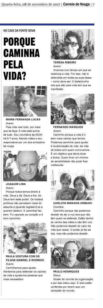 A caminhada foi organizada pela ADAV-Aveiro (Associação de Apoio e Defesa da Vida) e congregou pessoas de Aveiro, dos concelhos limítrofes, mas também de Coimbra, como Carlota Miranda Urbano, que explicou as razões da sua presença: “Caminho porque não podemos desistir de ser a voz dos que não têm quem os defenda. Estão dentro do ventre das mães e não têm voz. Não podemos desistir do valor da vida que nasce. O poder já fez as leis, mas nós não podemos desistir”.