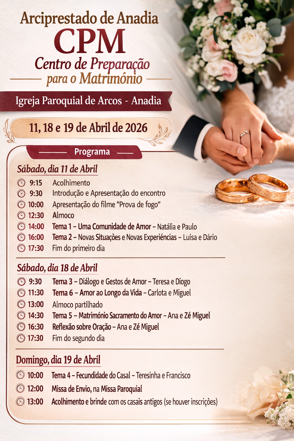 Nos dias 11, 18 e 19 de abril, a Igreja Matriz de Anadia acolheu uma atividade de preparação para o matrimónio, que reuniu 22 casais que desejam celebrar este sacramento. Ao longo dos três dias, os participantes foram convidados a refletir sobre os valores fundamentais do casamento cristão, aprofundando temas como uma comunidade de amor, novas situações-novas exigências, diálogo e gestos de amor, a fecundidade do casal, matrimónio, sacramento do amor e amor ao longo da vida.
