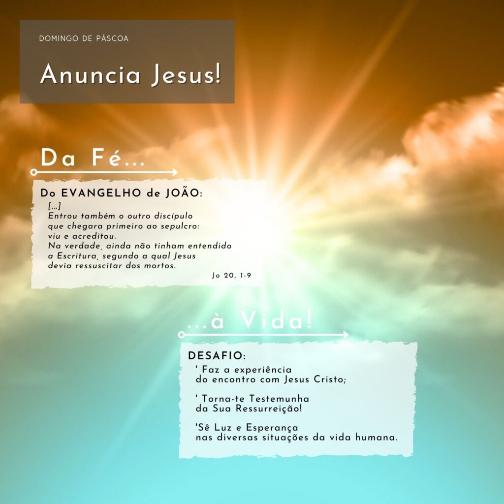 Jesus, à medida que acreditamos em Ti, começamos a ver-te agir na nossa vida, ajudando-nos, confortando-nos e guiando-nos. À medida que o nosso amor por Ti cresce, cresce também o amor pelos outros. A Fé na ressurreição dá-nos o grande conforto de sabermos que nunca estamos sós, de que Tu estás sempre connosco. É a Fé que nos faz desejar passar mais tempo conTigo na oração e descobrir o quanto Tu nos amas. Dá-nos Senhor a graça de saber viver à luz da Ressurreição, sem medos e na certeza e esperança da Vida eterna.