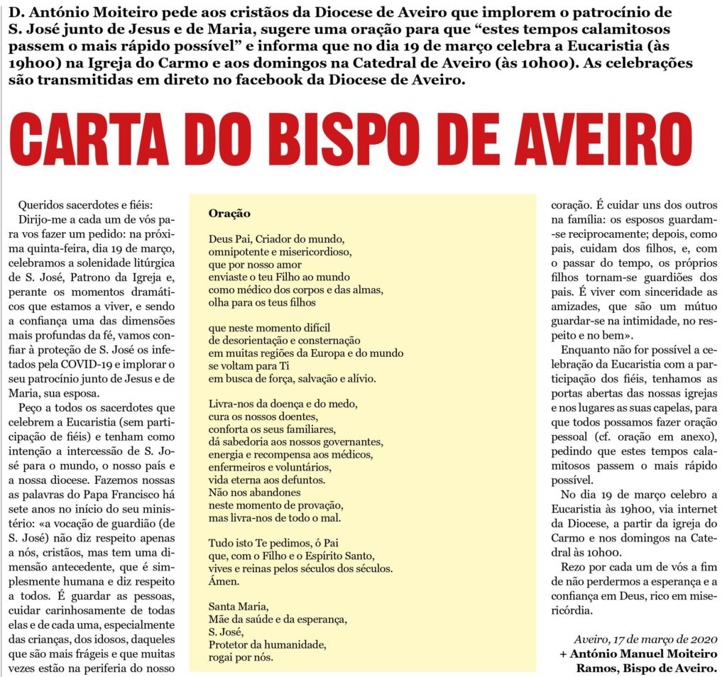 AUTORES I, COVID-19, D. ANTÓNIO MANUEL MOITEIRO RAMOS, DOCUMENTOS Documentos | Covid-19 | Carta de D. António Moiteiro aos cristãos da Diocese de Aveiro admin_cult 18 Março, 202020 Março, 2020 Documento recolhido do Correio do Vouga Imagem de Cassiopeia_Arts por Pixabay Navegação de artigos Covid 19 | Principais medidas tomadas na região de AveiroNotícias | Covid-19 | Papa reza pelos médicos e enfermeiros que perderam a vida e pede «proximidade» às vítimas da pandemia