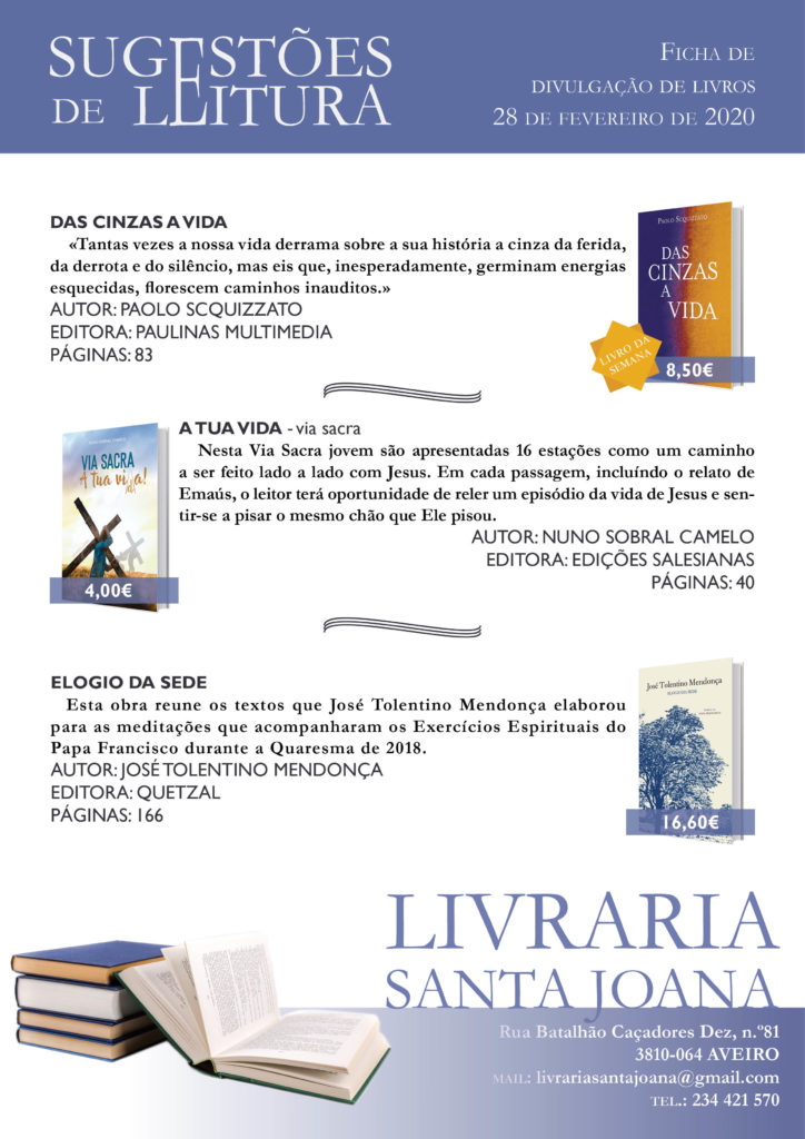 Comissão Diocesana da Cultura Seminário de Aveiro – Centro Pastoral Av. João Jacinto Magalhaes n.º 17 – 3814-506 Aveiro 234 181 293 cultura@diocese-aveiro.pt