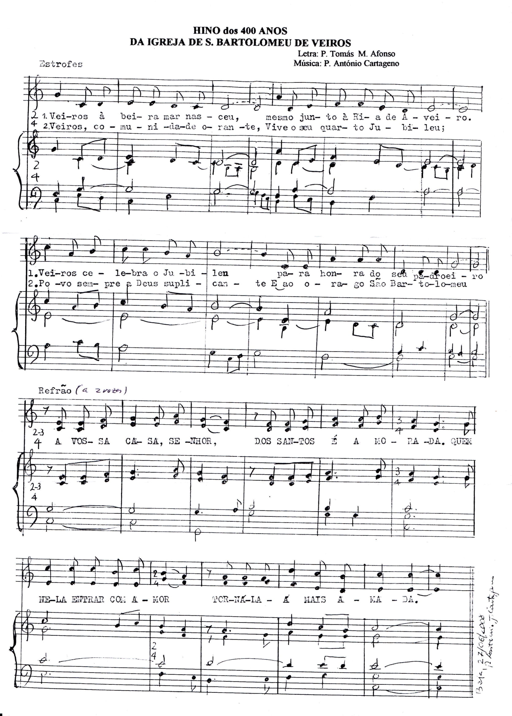 No final de Junho de 2008, o Padre António Cartageno enviou-me a partitura completa, com a letra musicada do Hino dos 400 anos da Igreja de São Bartolomeu de Veiros. A acompanhar a nova partitura, vinha uma breve missiva, que aqui se transcreve: