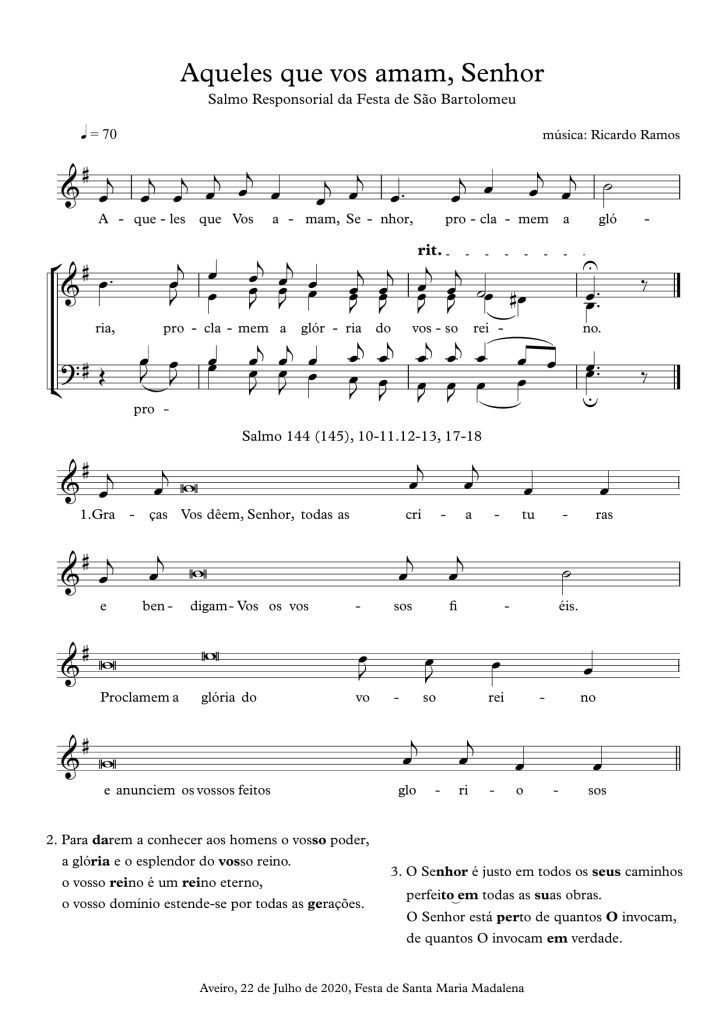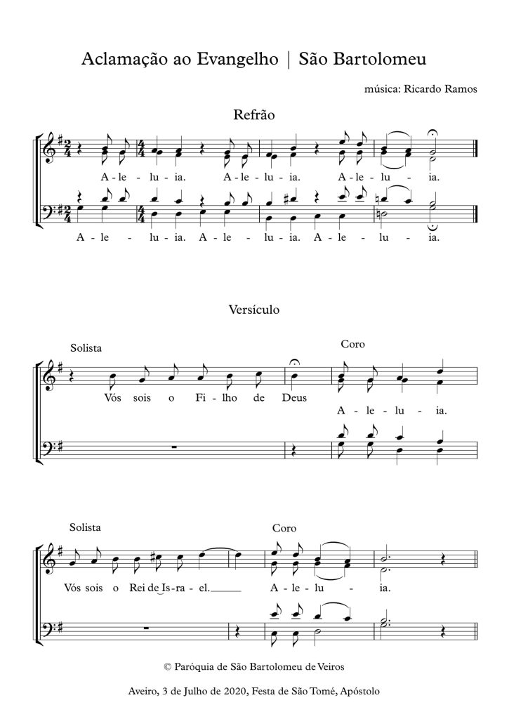 A composição musical do salmo responsorial foi assinada e datada por Ricardo Ramos, no dia 22 de Julho de 2020, e o “Aleluia”, a 3 de Julho do mesmo ano, os quais me enviou, enquanto responsável pelo Grupo Coral de Veiros, oferecendo o seu trabalho para assim melhor louvar a Deus e dignificar a celebração eucarística de 24 de Agosto, nesta Paróquia.