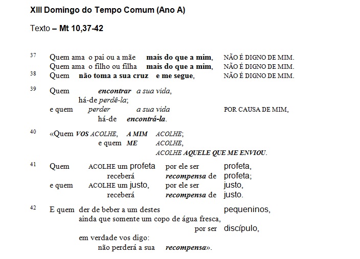 Neste contexto insere-se a página deste domingo. Se os discípulos de Jesus são aqueles que partilham sem reservas o seu destino, devem ter em conta a divisão e os conflitos até nas relações familiares. A pertença a Cristo não passa através do clã familiar, nem se transmite com a herança do sangue. É uma escolha pessoal que, por vezes, pode pôr em discussão até os laços familiares. Na exigência de seguimento proposta por Jesus ressoa o absoluto de Deus que não admite concorrentes («O pai ou a mãe… o filho ou a filha… mais do que a mim»).