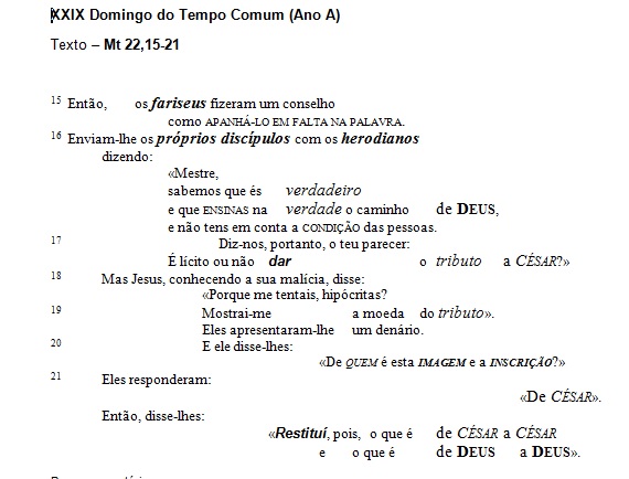 O Evangelho de Mateus tem apresentado as controvérsias de Jesus com os diversos grupos religiosos, particularmente os chefes dos sacerdotes e anciãos do povo. O texto deste domingo apresenta-nos dois grupos diferentes, fariseus e herodianos, que passam ao ataque, dirigindo-se a Jesus com uma pergunta capciosa: «É lícito ou não dar o tributo a César?»