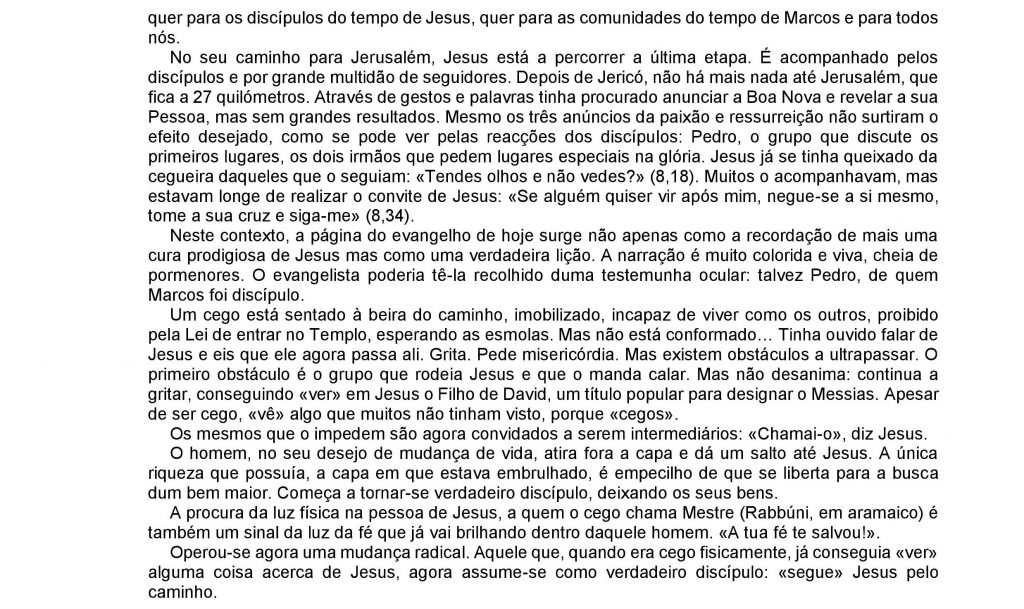 AUTORES II, OLHAR SOBRE OS EVANGELHOS, OLHARES II, PE. JÚLIO FRANCLIM DO COUTO E PACHECO XXX Domingo do Tempo Comum (Ano B) admin_cult 22 Outubro, 2018 XXX Domingo do Tempo Comum (Ano B) Pe. Franclim Pacheco O texto – Mc 10,46-52 Navegação de artigos Bens culturais: Critérios e práticas de conservação preventiva discutidos em AveiroTeste a sua cultura religiosa 52
