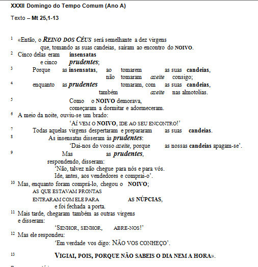 Este texto do evangelho segundo Mateus está inserido no chamado «discurso escatológico» que vem na sequência do comentário dos discípulos acerca da grandiosidade do templo ao qual Jesus responde: «Vedes tudo isto? Em verdade vos digo que não ficará aqui pedra sobre pedra: tudo será destruído». Sainda do Templo, e sentado no Monte das Oliveiras, contemplando o Templo, os discípulos perguntam-lhe em particular: «Diz-nos quando acontecerá tudo isto e qual o sinal da tua vinda e do fim do mundo» (Mt 24,2-3). Nos dois capítulos seguintes vai alertando os seus discípulos para não se deixarem enganar nem pelos de fora nem pelos de dentro, apelando sobretudo para a vigilância.