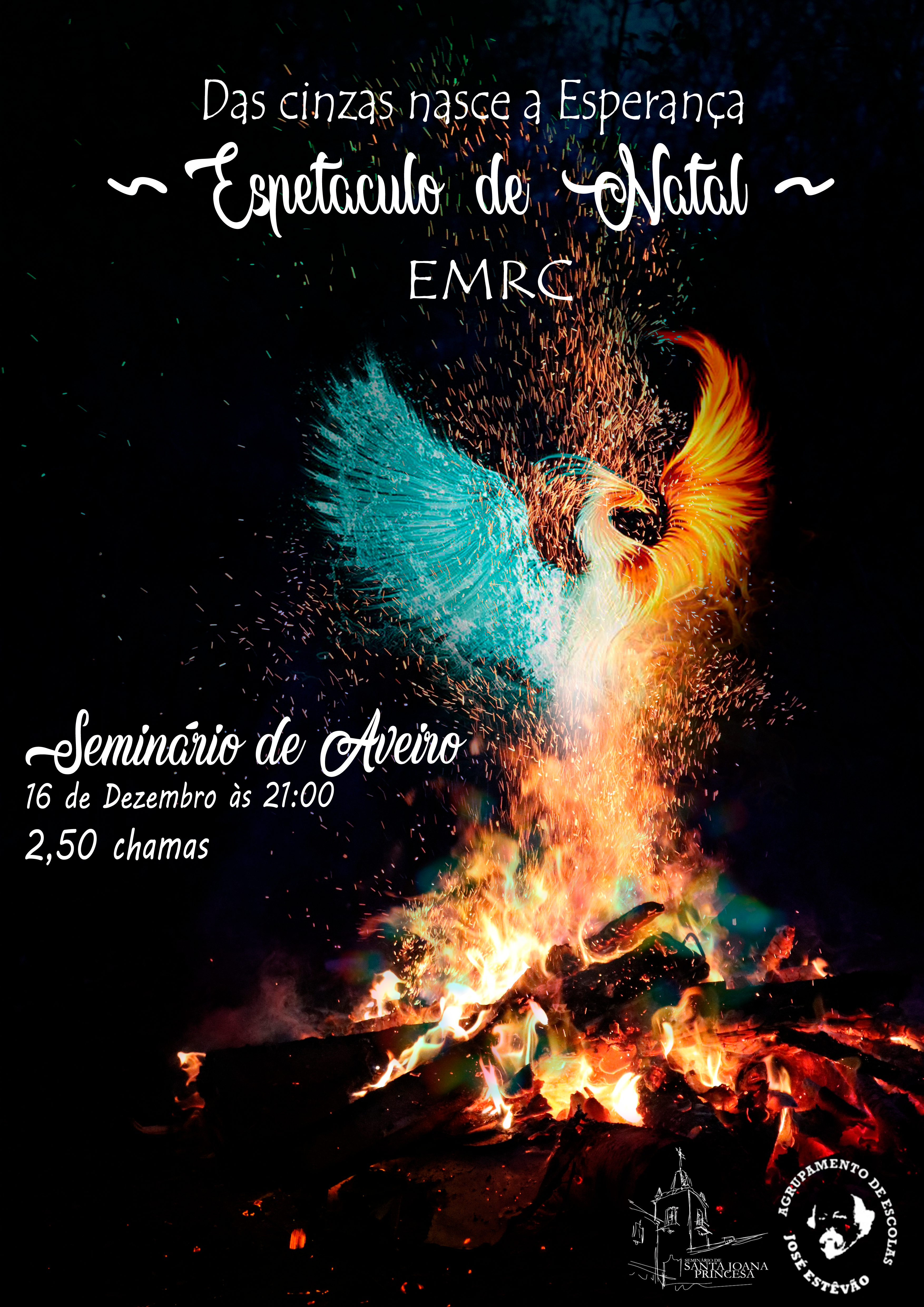 Os alunos inscritos à disciplina de EMRC estão a organizar um espetáculo de Natal ” Das cinzas nasce a Esperança” com o objetivo de angariar fundos para a viagem a Taizé…e claro que têm muito gosto da vossa presença, no dia 16 de dezembro( sábado), pelas 21h, no Seminário Santa Joana Princesa de Aveiro.