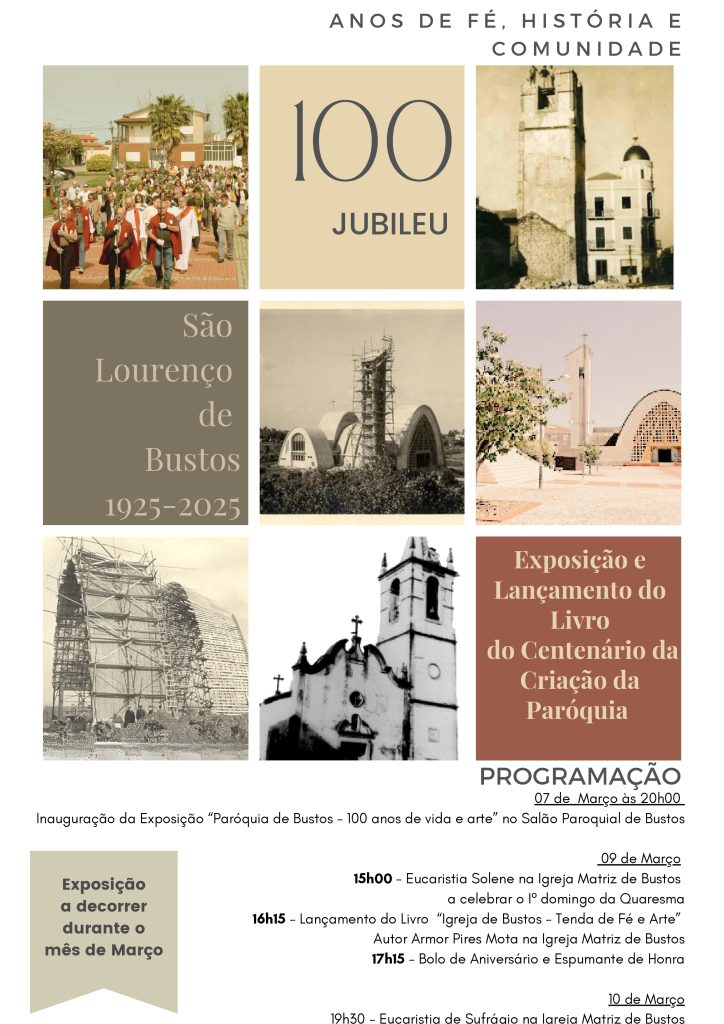 Dia 9 (domingo): – 15.00 horas: celebração da missa (animação litúrgica dos cânticos – Orfeão de Bustos) presidida pelo vigário-geral da diocese, padre Joaquim Rocha. – 16.15 horas, na igreja, apresentação pelo vigário-geral do livro “Igreja de Bustos Tenda de Fé e Arte – 100 Anos da Paróquia de S. Lourenço”, da autoria de Armor Pires Mota. O livro releva todo um tempo de grande epopeia do povo de Bustos e dezenas de fotografias consagram a união e a coragem de todo um povo e fazem memória de um tempo e de um templo que é seu grande orgulho, graças ao pároco de então, padre António Henrique Vidal, que soube servir-se muito bem do poder mediático (notícias e entrevistas), nomeadamente a nível do Correio do Vouga. Encerrará o programa deste dia com a partilha de bolo de aniversário e espumante de honra.
